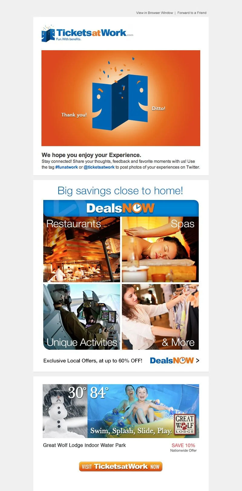 As Lead for EBG’s in-house creative team, my job was to bring the TicketsatWork brand to life through various marketing initiatives being delivered through multiple channels.