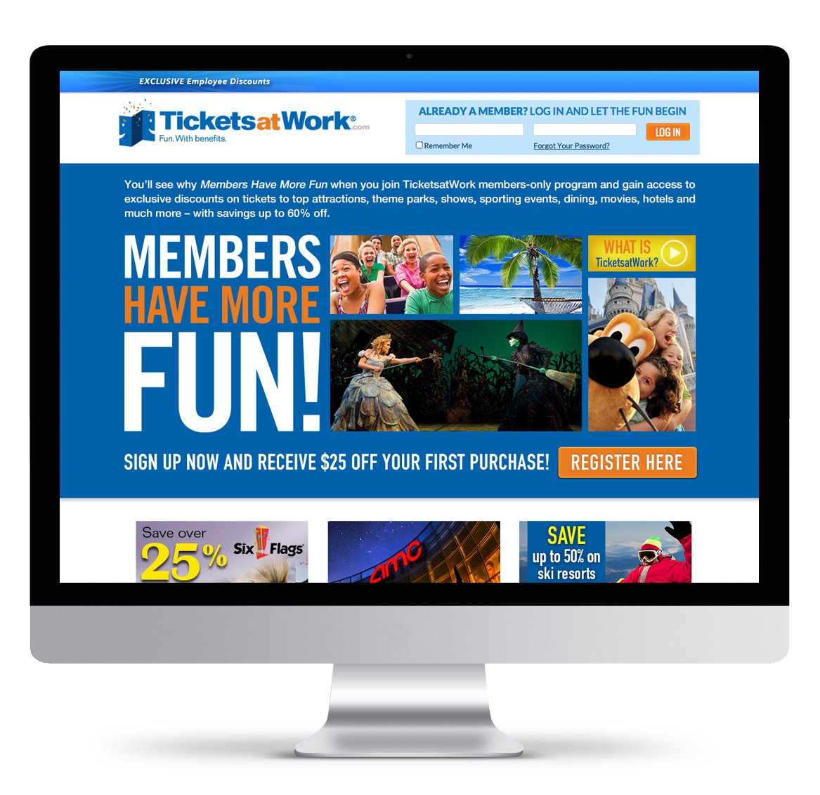 Every company that joined TicketsatWork would receive a unique code for employees to use when signing up. Members Have More Fun! campaign was developed to target employees who had yet to enroll with a discount on their first purchase. Discount incentives were also provided to current members who encouraged fellow co-workers to sign up and join the fun.